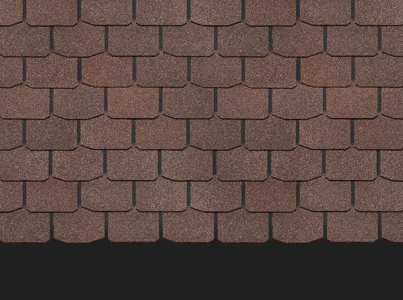 Натуральные коричневые оттенки черепицы хорошо сочетаются с фасадами в сливочных и светло-зеленых тонах. Лепестки лаконичной формы не отвлекают внимание от деталей кровли. Благородный матовый блеск гранулята подчеркивает класс материала.