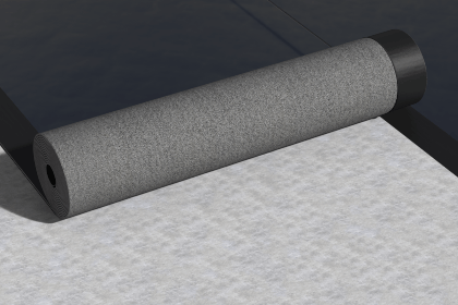 Рулонный битумно-полимерный СБС-модифицированный материал на нетканой основе из высокопрочного полиэстера с легкосгораемой полиэтиленовой пленкой на верхней стороне полотна и мелкозернистой посыпкой на нижней.
