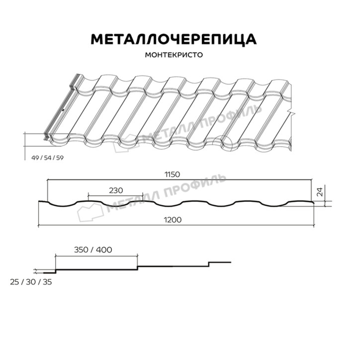 МОНТЕКРИСТО ― новый выразительный профиль металлочерепицы. Его полная глубина составляет 49, 54, 59 мм. Словно подлинная драгоценность, он станет украшением вашего дома на долгое время. Стальная черепица МОНТЕКРИСТО красиво смотрится на крыше любой площади: даже малые скатыприобретут необходимую выразительность. Мягкие линии профиля притягивают внимание к вашему дому. В процессе производства указанного кровельного материала используется особая технология фигурного реза. Сталь обрабатывается на высокотехнологичном оборудовании, по этой причине листы отлично стыкуются. Изысканный и элегантный ― это профиль МОНТЕКРИСТО.